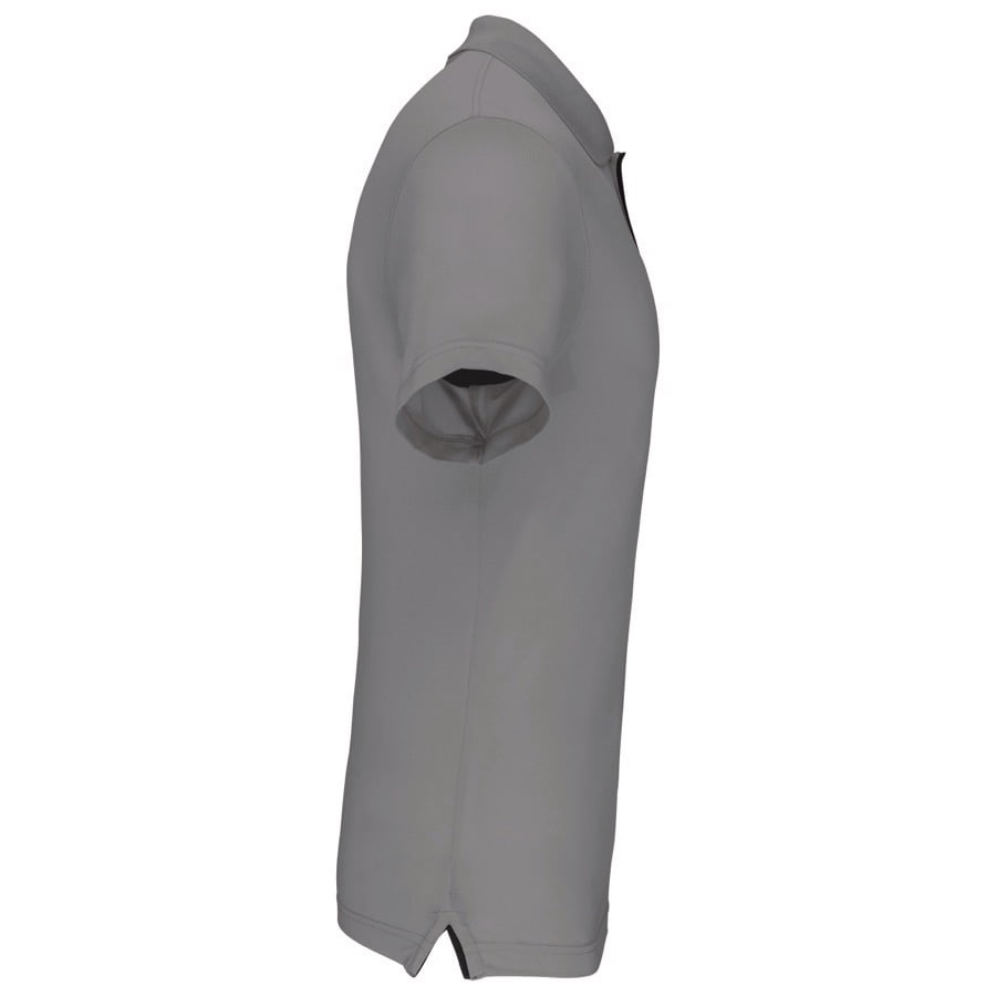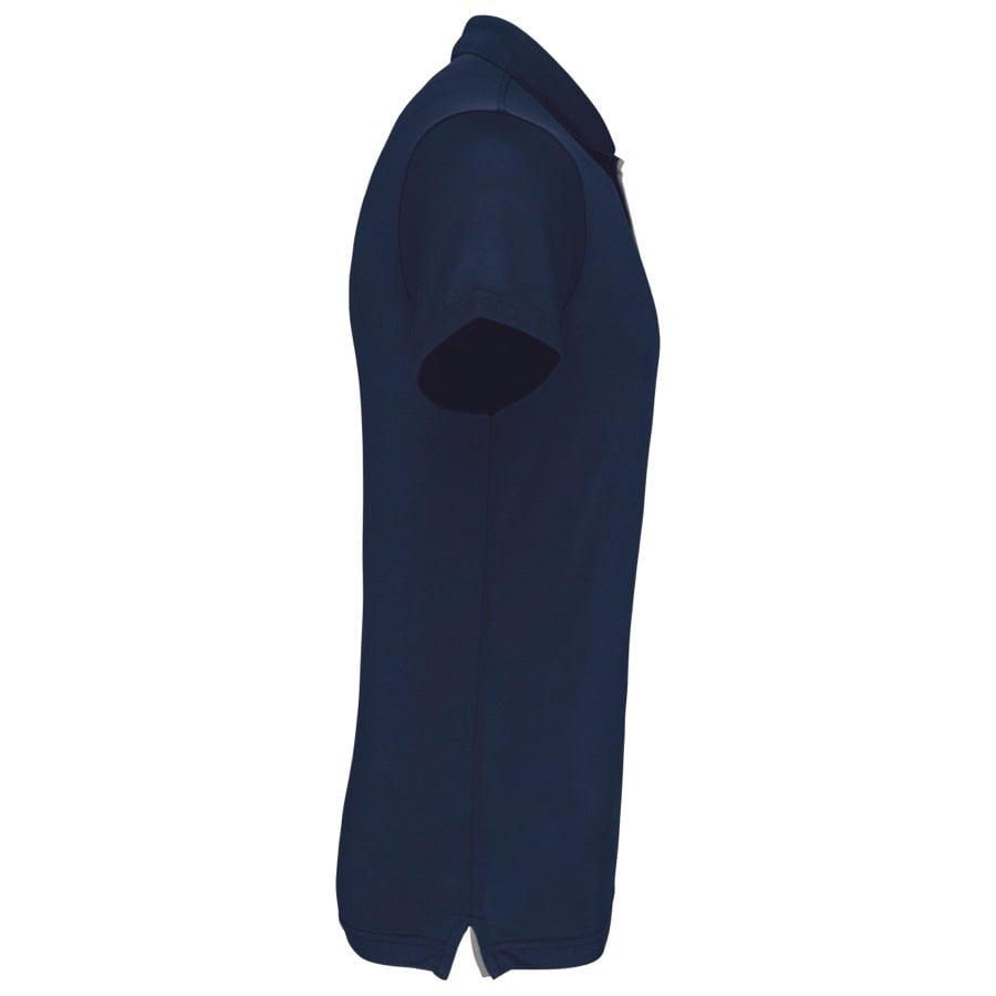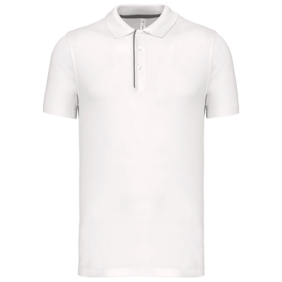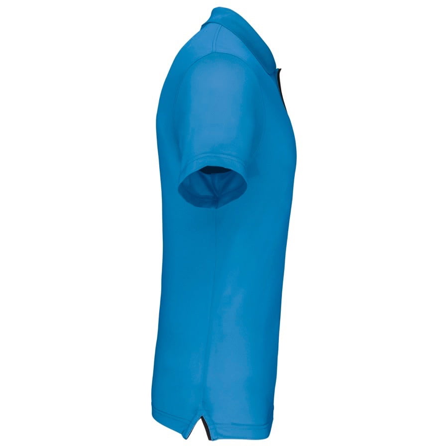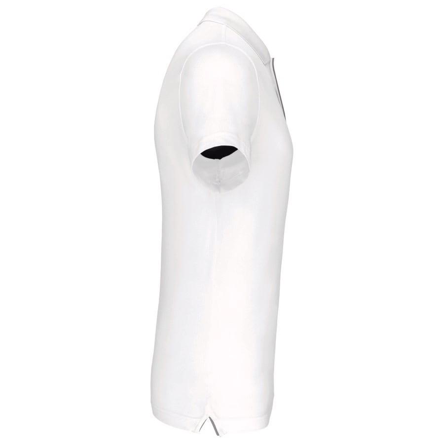 95% polyester / 5% elasthan. Ademende en anti-statische stof. Piqué. Kraag in rib. Knooplijst met 3 knopen en gecontrasteerde bies. Nektape en zijsplitjes in contrastkleur. Afwerking met dubbele stiksels. Gecertificeerd STANDARD 100 by OEKO-TEX®N° CQ1007/7, IFTH.