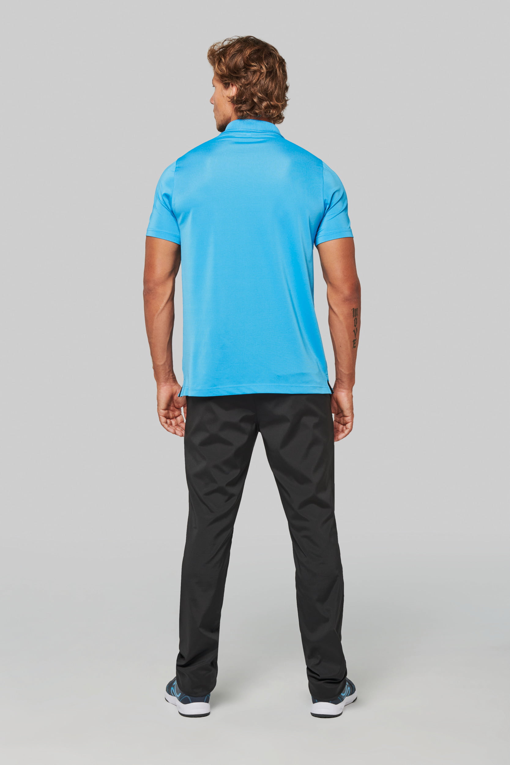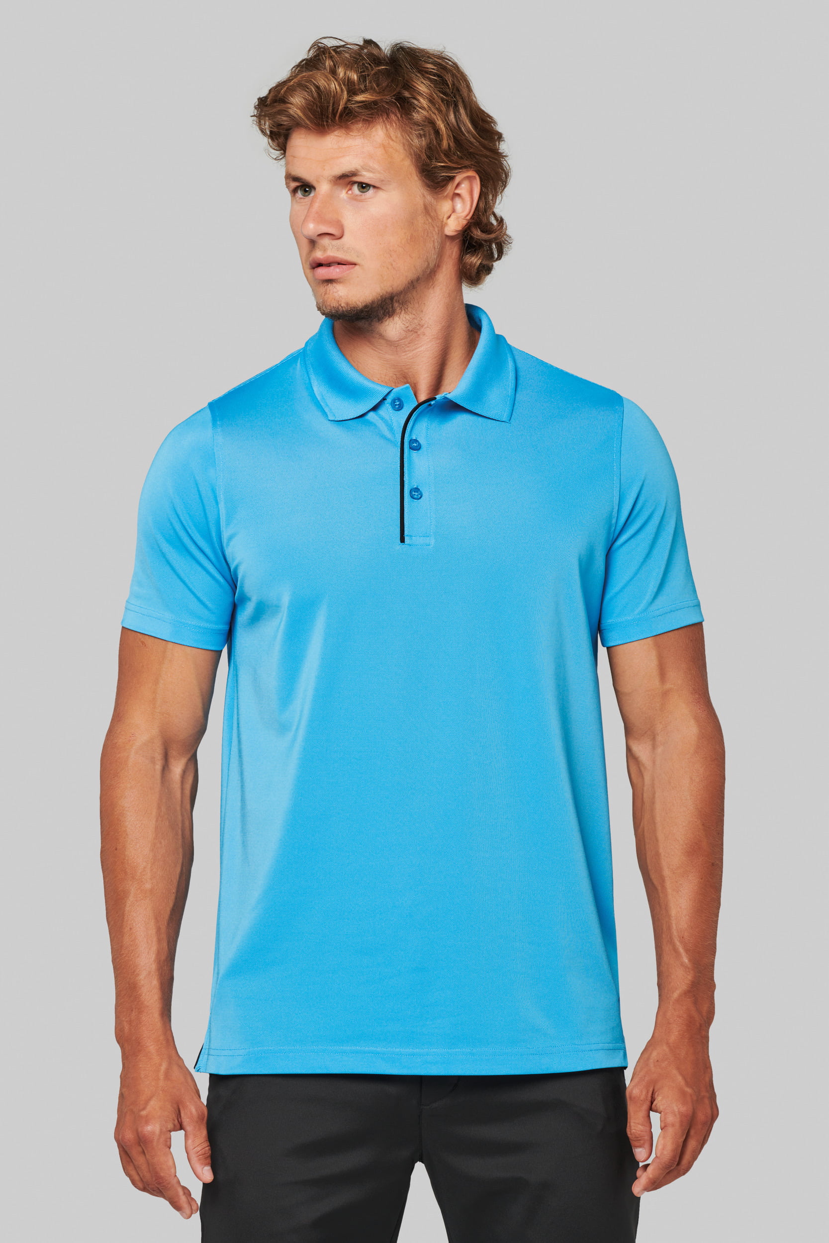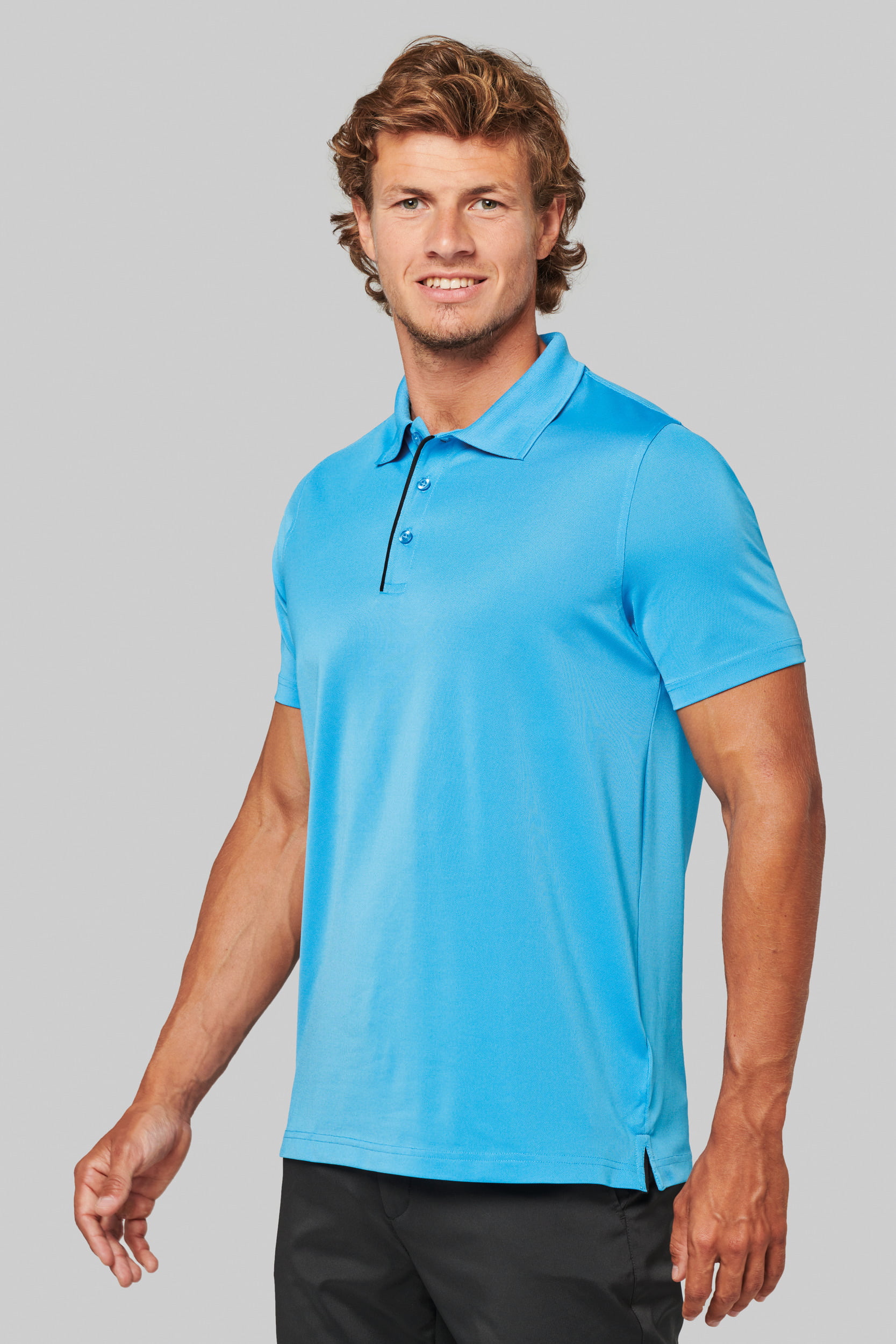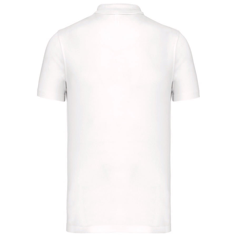 95% polyester / 5% elasthan. Ademende en anti-statische stof. Piqué. Kraag in rib. Knooplijst met 3 knopen en gecontrasteerde bies. Nektape en zijsplitjes in contrastkleur. Afwerking met dubbele stiksels. Gecertificeerd STANDARD 100 by OEKO-TEX®N° CQ1007/7, IFTH.