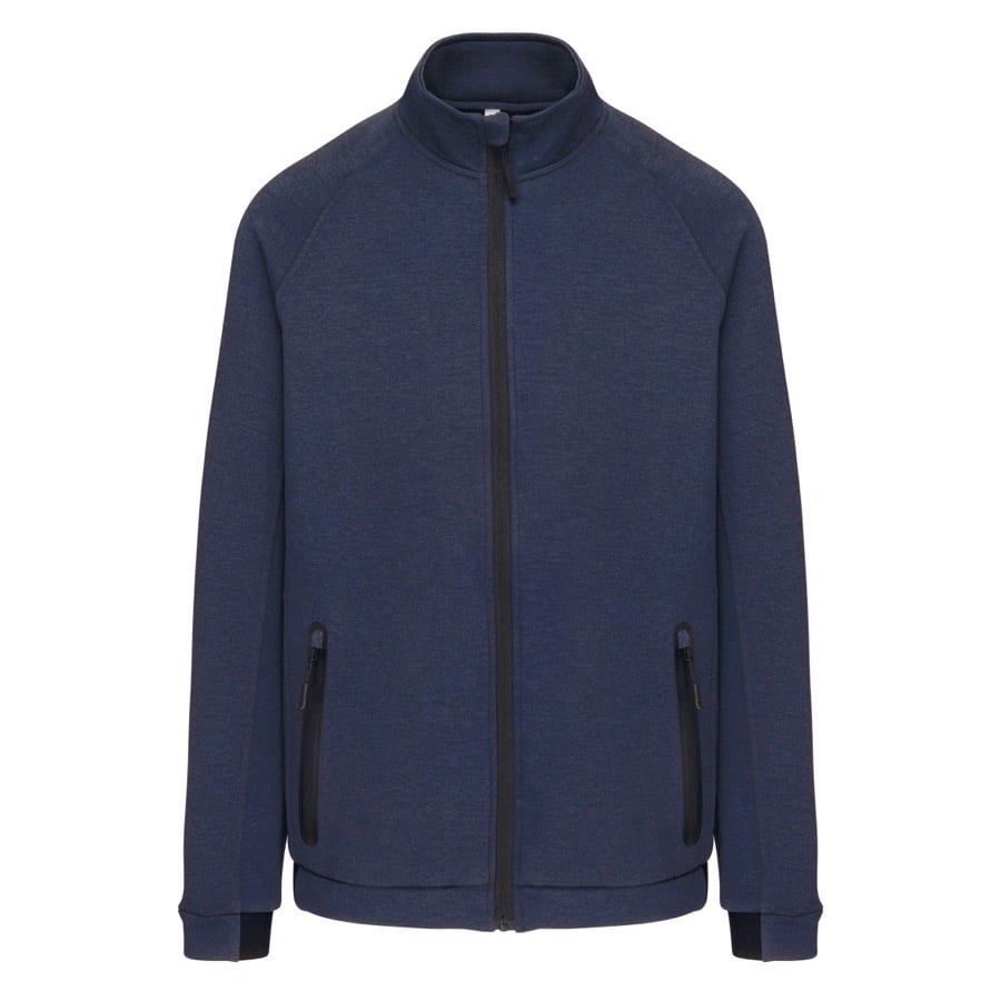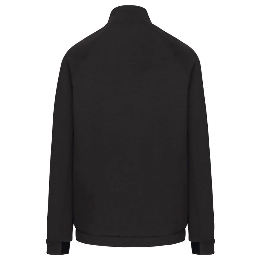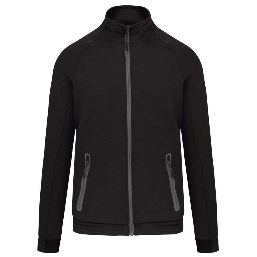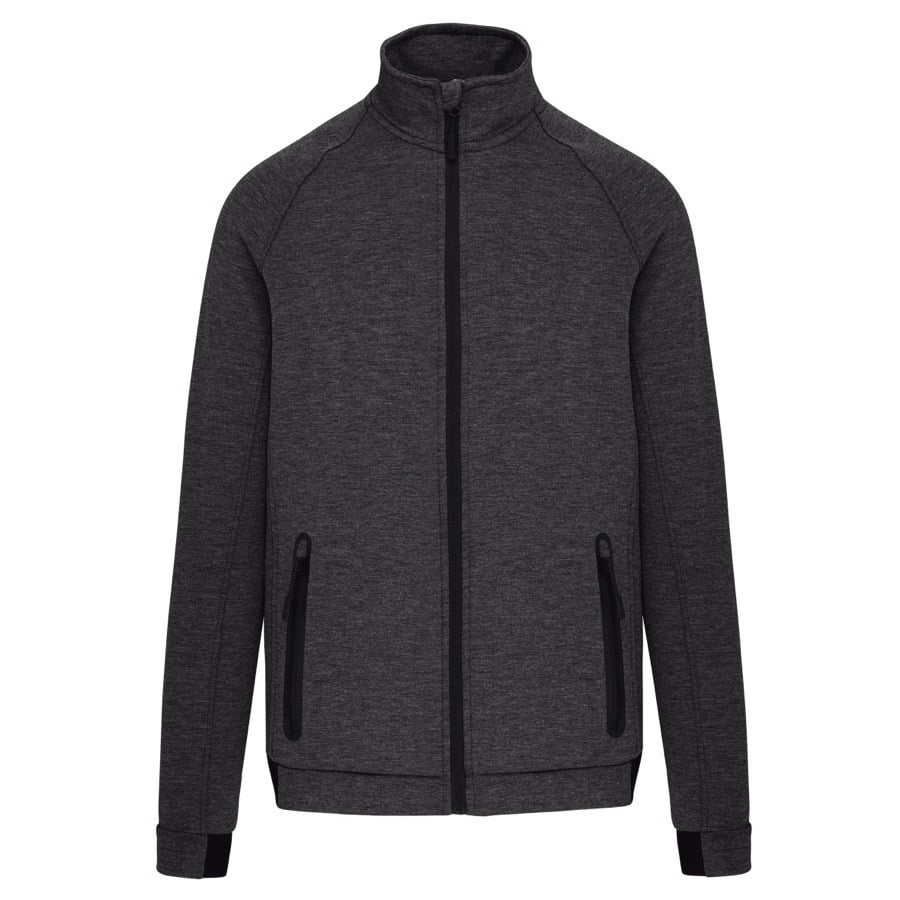 94% polyester / 6% elasthan (79% polyester / 15% viscose / 6% elasthan voor Heather kleur). Hele comfortabele stof. Ritssluiting. 2 ritszakken met warmtegelaste afwerking aan de voorkant. Nauwsluitende boorden aan de mouwen en onderaan, met een elastisch stuk Black op alle kleuren en Dark Grey op de Ash Heather (sluitingen ook). Ideaal om te dragen op trainingsbroek PA1008 in een total Urban Apparel stijl.