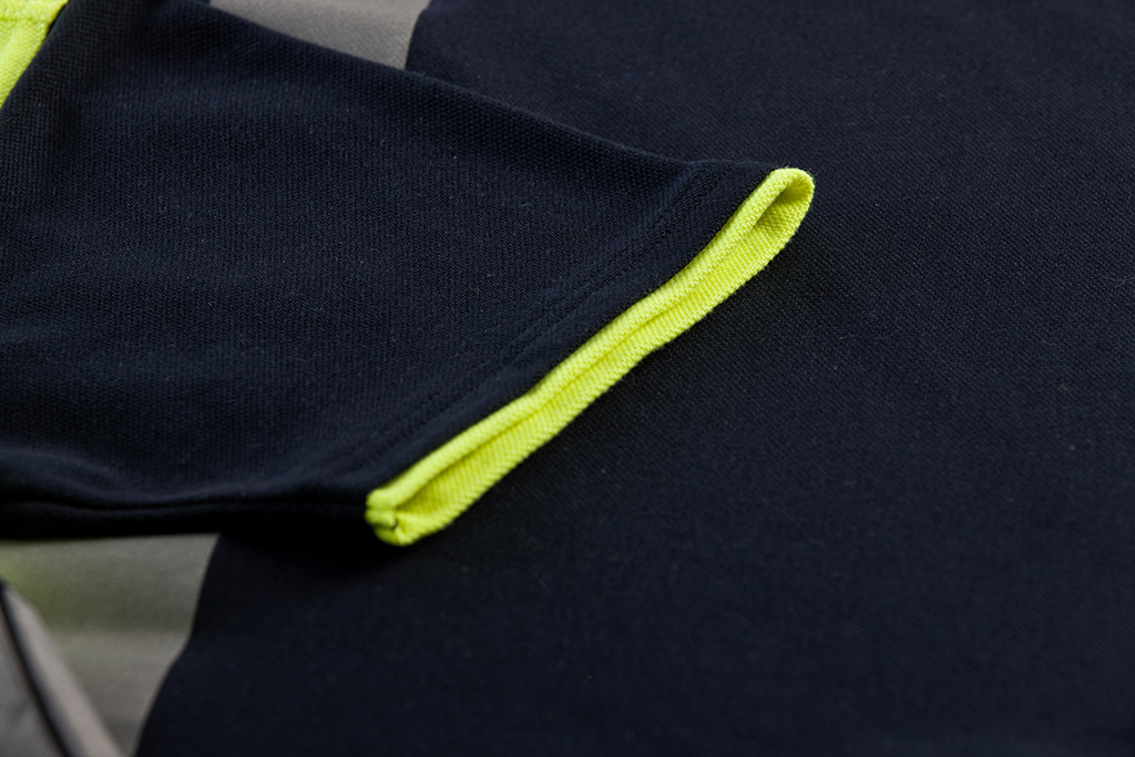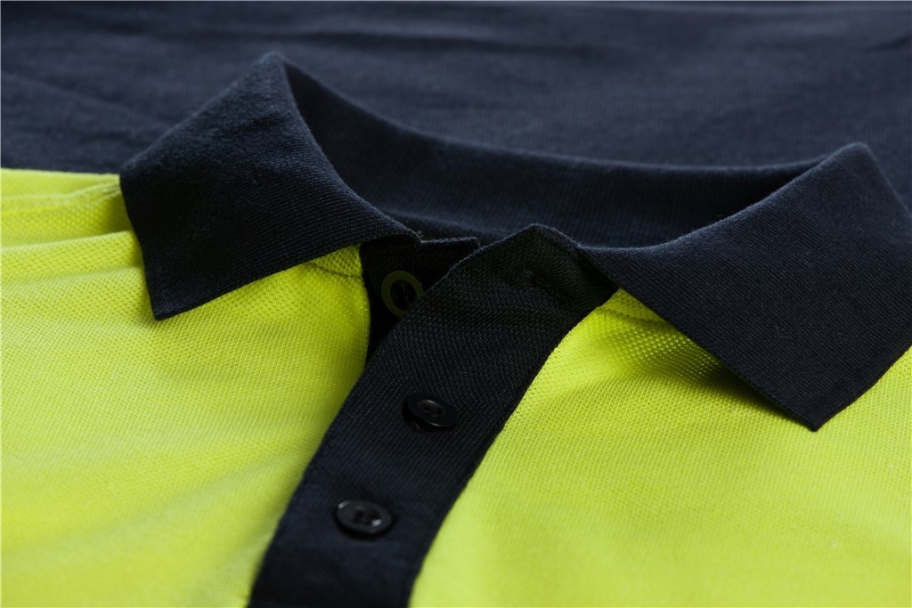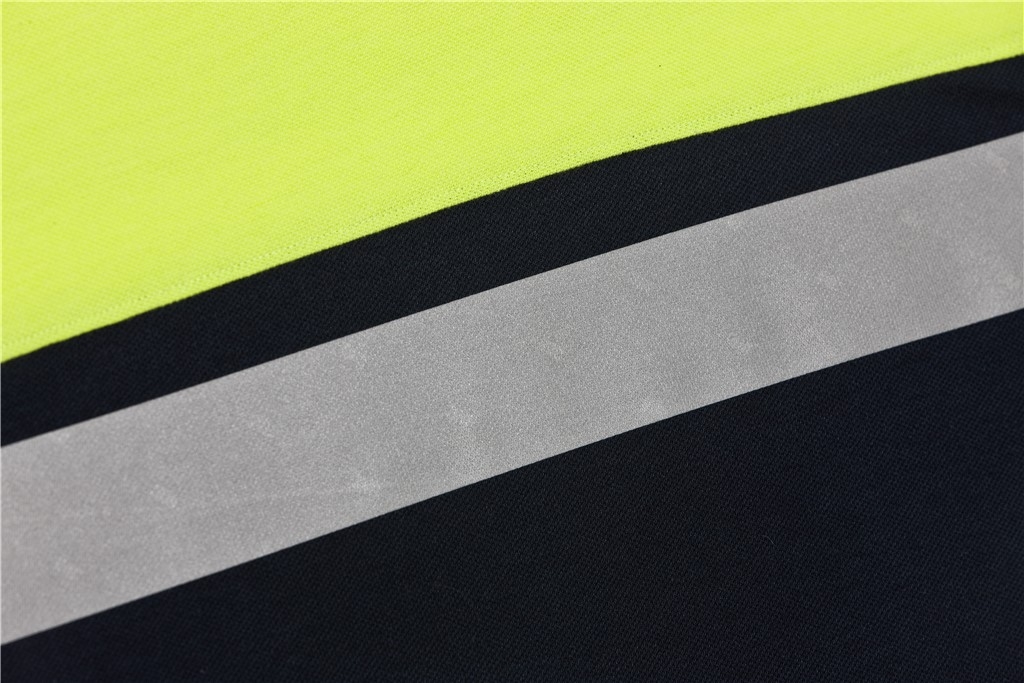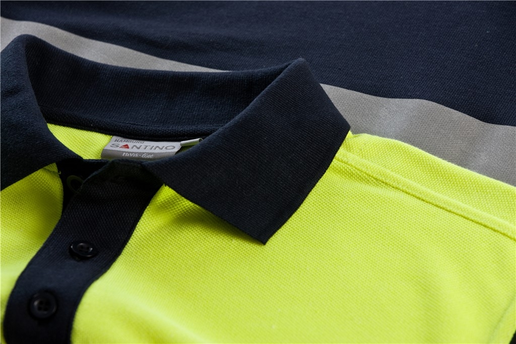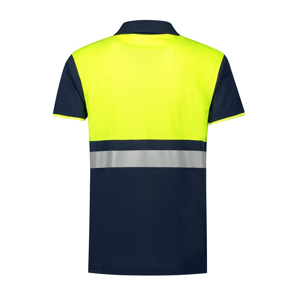 Poloshirt, 70% polyester / 30% katoen, 220 gr/m², piqué, regular fit met polokraag, 3-knoopsluiting, splitjes in zijnaad, verlengd achterpand en geel fluoriserend bovenstuk met getransfereerd 3M zilver reflectie tape.