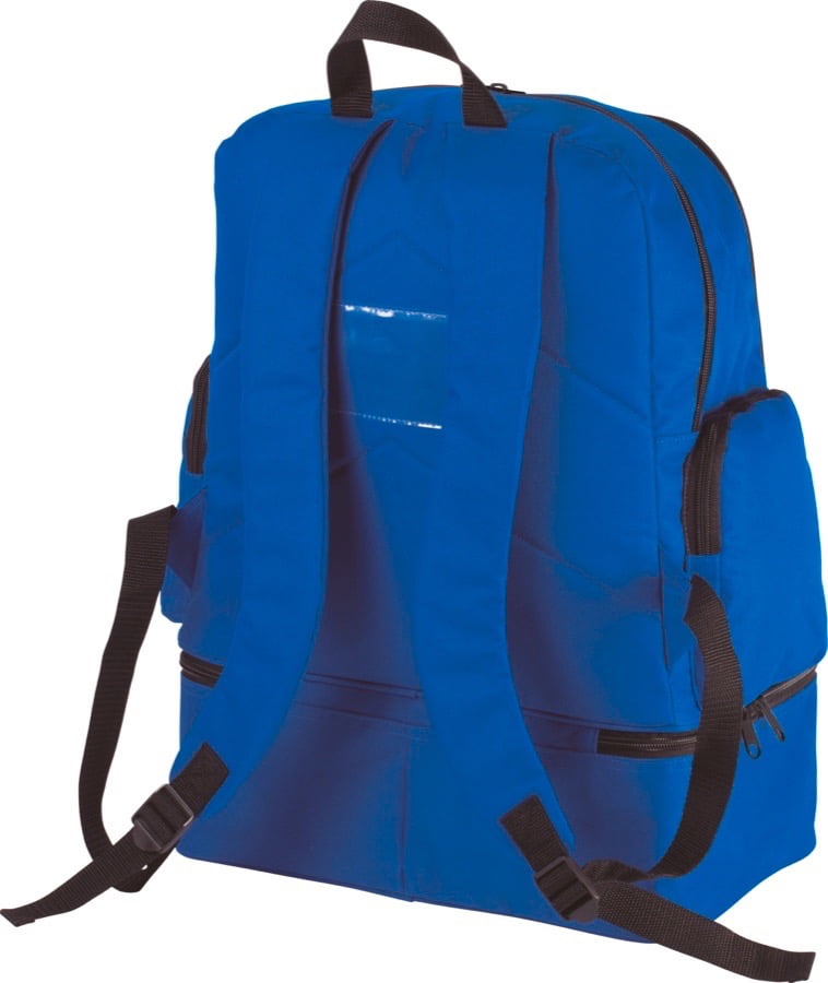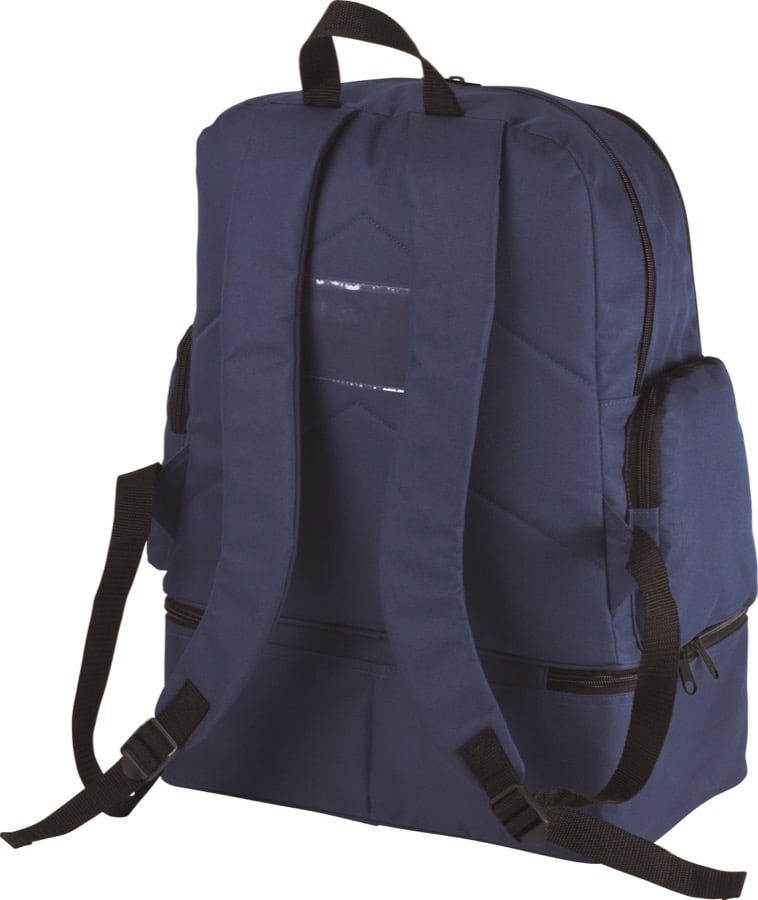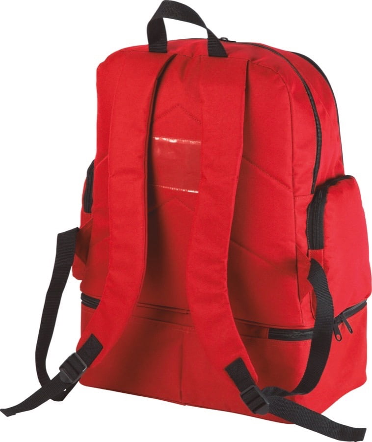 Polyester 600D. Verstevigde uitneembare bodem in polyproylene met voetjes in plastic. Voorzak met rits om de personalisatie te vereenvoudigen. 2 zijzakken. Kaarthouder. Verstevigde bodem geleverd met de rugzak.