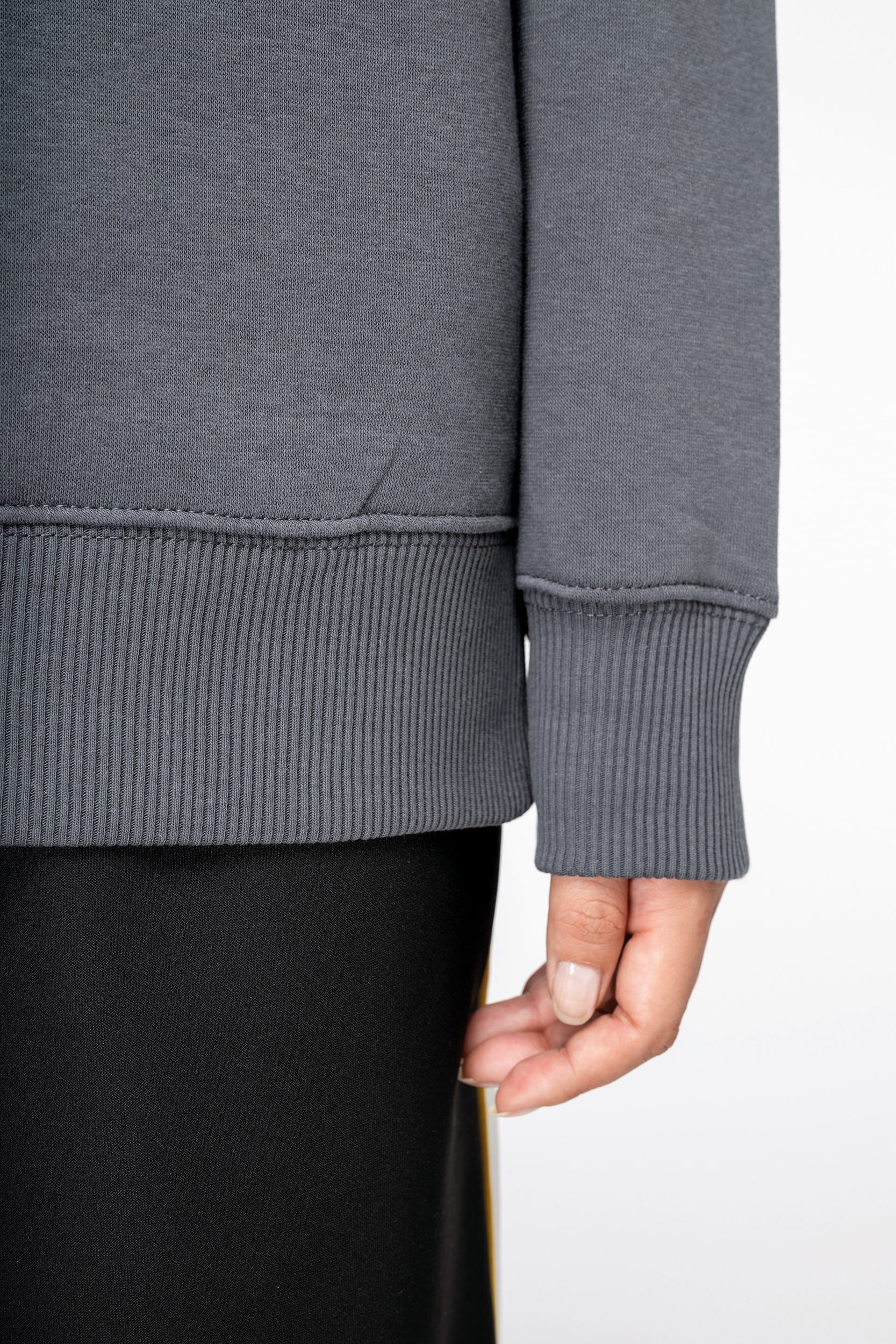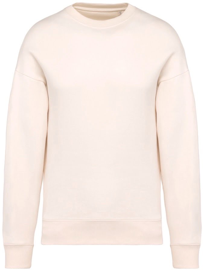 85% biologisch katoen en 15% gerecycled polyester Gekamd en ringgesponnen katoen Uniseks Oversized model met afhangende schouders Geborsteld fleece 3 draden LSF (Low Shrinkage Fleece) Halvemaan op de achterkant 2×1 ribboord aan de kraag, de zoom en de manchetten Dubbel stiksel aan weerszijden van de kraag, op de manchetten en de zoom Toon op toon nektape met kepermotief in de halsopening